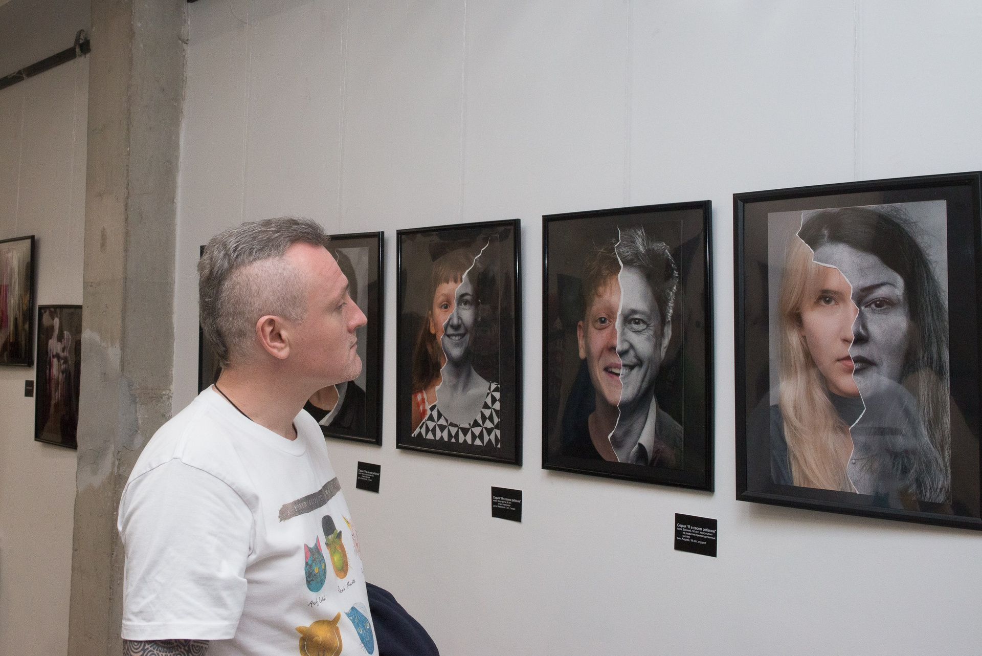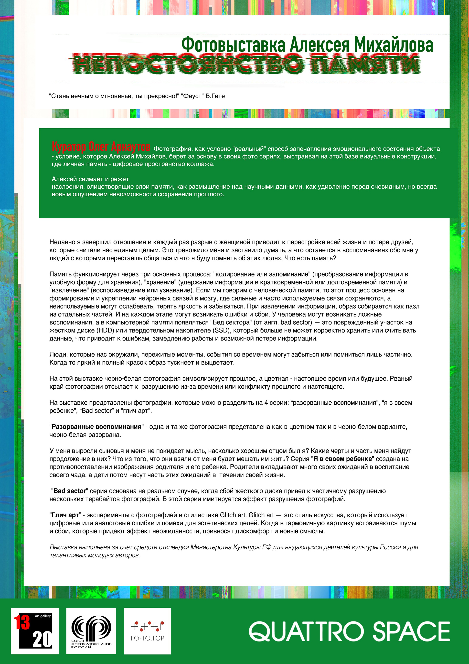 На выставке представлены фотографии, которые можно разделить на 4 серии: «разорванные воспоминания», «я в своем ребенке», «Bad sector» и «глич арт».